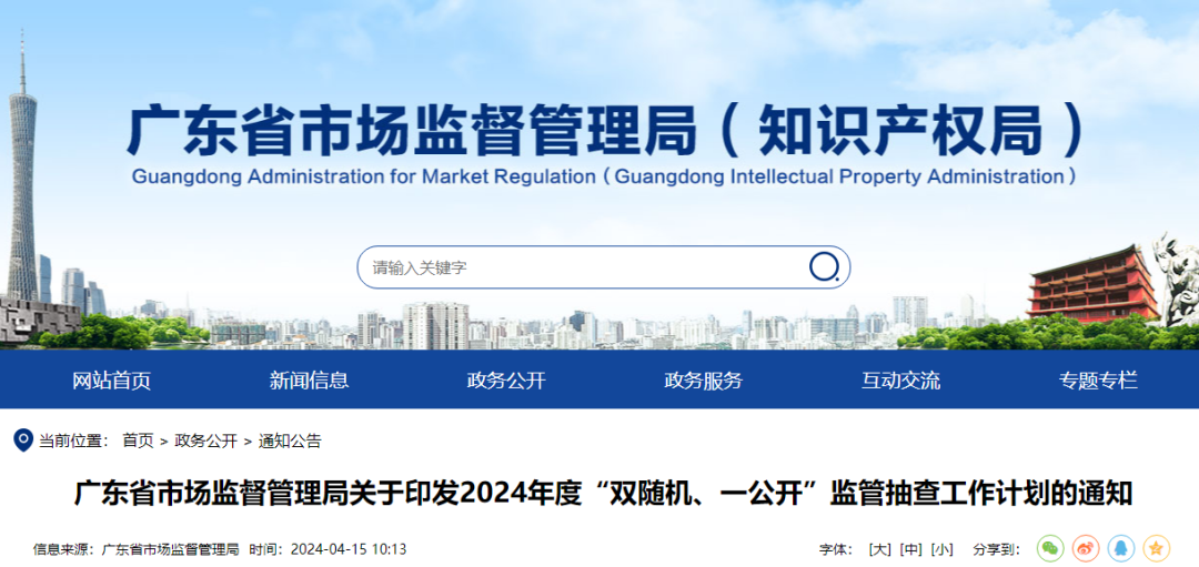 廣東省市場監督管理局關于印發2024年度“雙隨機、一公開”監管抽查工作計劃的通知