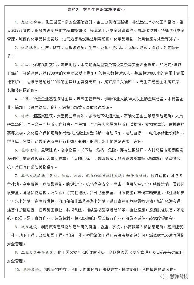 深化專項整治。深入推進危險化學品、礦山、消防、交通運輸、建筑施工、民爆、特種設備、大型商業綜合體等重點行業領域安全整治,解決影響制約安全生產的薄弱環節和突出問題,督促企業嚴格安全管理、加大安全投入、落實風險管控措施。結合深化供給側結構性改革,推動安全基礎薄弱、安全保障能力低下且整改后仍不達標的企業退出市場。統籌考慮危險化學品企業搬遷和項目建設審批,優先保障符合條件企業的搬遷用地。持續推進企業安全生產標準化建設,實現安全管理、操作行為、設施設備和作業環境規范化。推動淘汰落后技術、工藝、材料和設備,加大重點設施設備、儀器儀表檢驗檢測力度。推動各類金融機構出臺優惠貸款等金融類產品,大力推廣新技術、新工藝、新材料和新裝備,實施智能化礦山、智能化工廠、數字化車間改造,開展智能化作業和危險崗位機器人替代示范。強化危險廢物全過程監管,動態修訂《國家危險廢物名錄》,修訂危險廢物鑒別、貯存以及水泥窯協同處置污染控制等標準,制定完善危險廢物重點監管單位清單。建立廢棄危險化學品等危險廢物監管協作和聯合執法工作機制,加強危險廢物監管能力與應急處置技術支持能力建設。