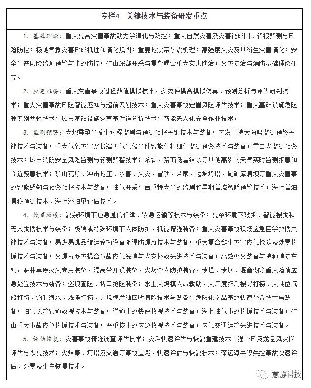 深化應用基礎研究。聚焦災害事故防控基礎問題,強化多學科交叉理論研究。開展重大自然災害科學考察與調查。整合利用中央和地方政府、企業以及其他優勢科技資源,加強自主創新和“卡脖子”技術攻關。實施重大災害事故防治、重大基礎設施防災風險評估等國家科技計劃項目,制定國家重大應急關鍵技術攻關指南,加快主動預防型安全技術研究。