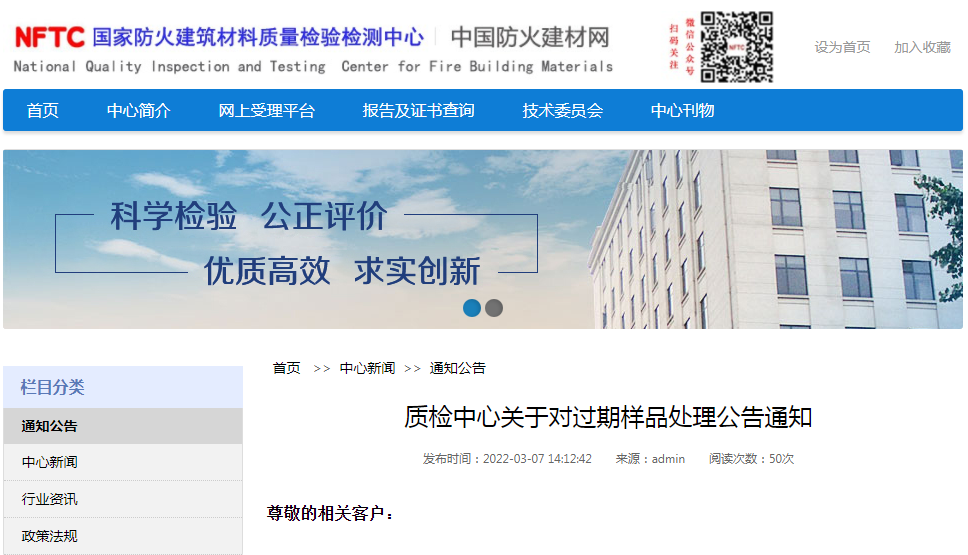 貴公司送到國家防火建筑材料質(zhì)量檢驗(yàn)檢測中心(以下簡稱質(zhì)檢中心)的待檢樣品已超過90天,未辦理完成檢驗(yàn)手續(xù),多次致電,貴公司仍未開展下一步工作。按照質(zhì)檢中心管理體系文件《程序文件、管理制度》(第六版)中ZCX7.4-1-2019《樣品管理程序》中5.6條的規(guī)定“送到中心的樣品,客戶應(yīng)在60日內(nèi)辦理相關(guān)檢驗(yàn)申請,如送至中心后超過60日仍未辦理相關(guān)手續(xù),中心在網(wǎng)上公示,由技術(shù)科分類處置樣品”。