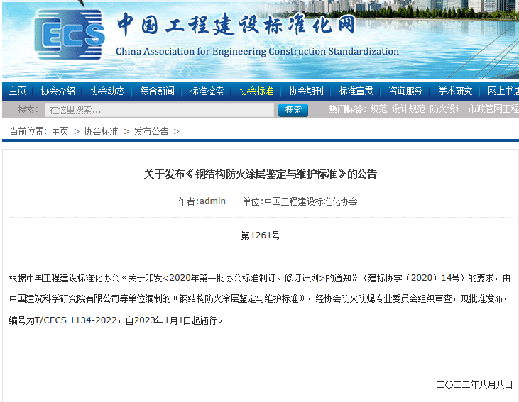 根據(jù)中國(guó)工程建設(shè)標(biāo)準(zhǔn)化協(xié)會(huì)《關(guān)于印發(fā)<2020年第一批協(xié)會(huì)標(biāo)準(zhǔn)制訂、修訂計(jì)劃>的通知》(建標(biāo)協(xié)字〔2020〕14號(hào))的要求,由中國(guó)建筑科學(xué)研究院有限公司等單位編制的《鋼結(jié)構(gòu)防火涂層鑒定與維護(hù)標(biāo)準(zhǔn)》,經(jīng)協(xié)會(huì)防火防爆專(zhuān)業(yè)委員會(huì)組織審查,現(xiàn)批準(zhǔn)發(fā)布,編號(hào)為T(mén)/CECS 1134-2022,自2023年1月1日起施行。