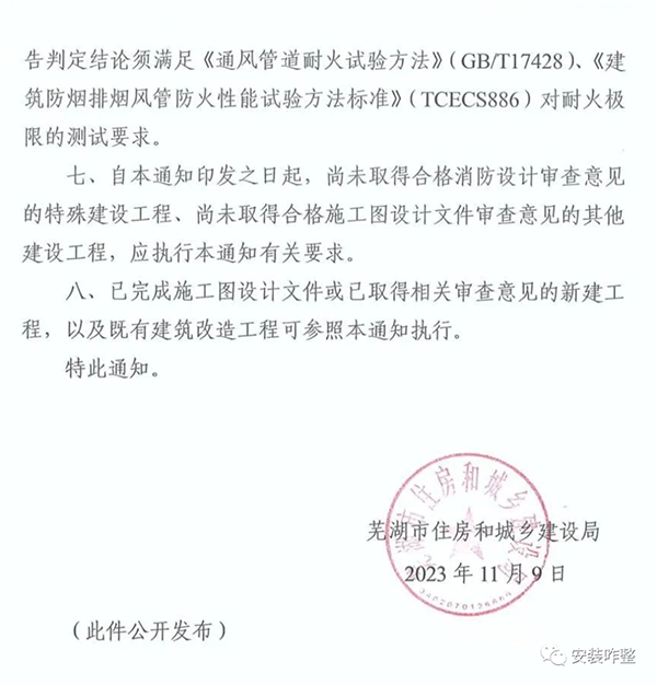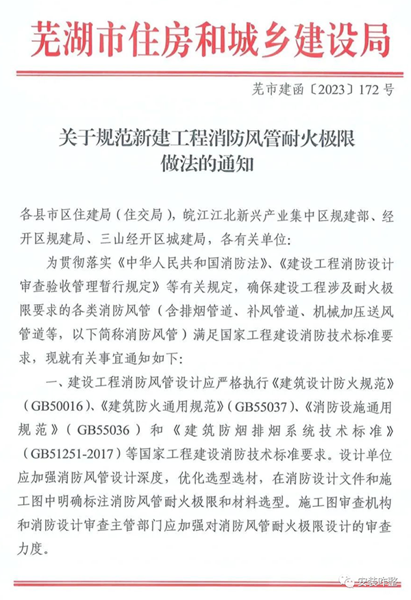 蕪市建函[2023]172號《關于規范新建工程消防風管耐火極限做法的通知》