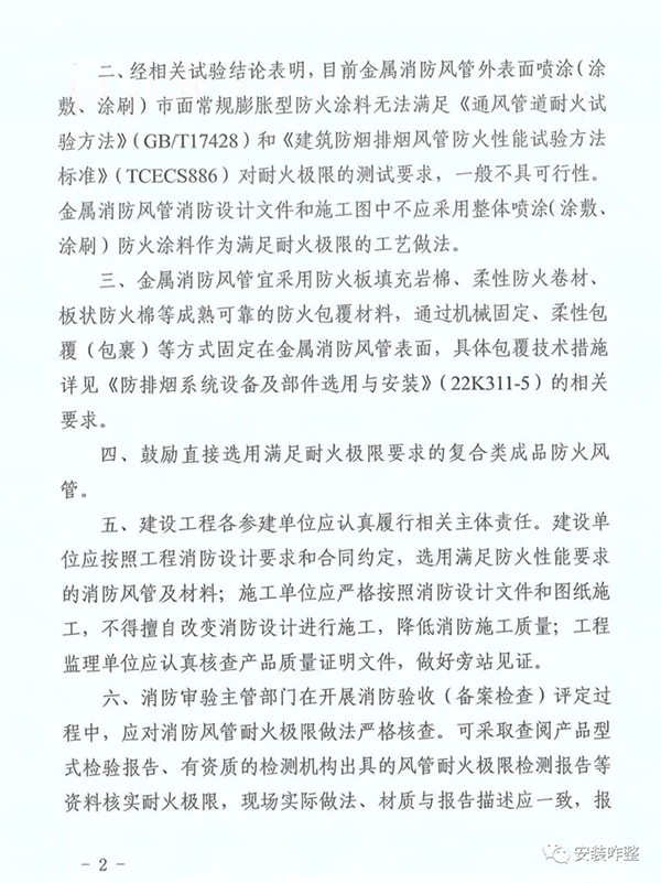 五、建設工程各參建單位應認真履行相關主體責任。建設單位應按照工程消防設計要求和合同約定,選用滿足防火性能要求的消防風管及材料;施工單位應嚴格按照消防設計文件和圖紙施工,不得擅自改變消防設計進行施工,降低消防施工質量;工程監理單位應認真核查產品質量證明文件,做好旁站見證。