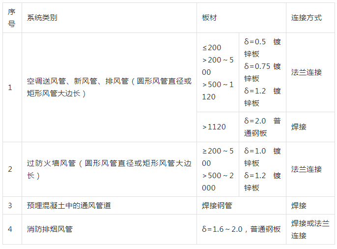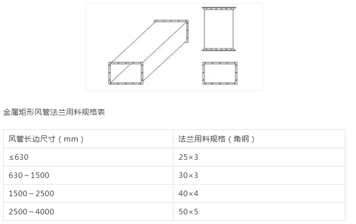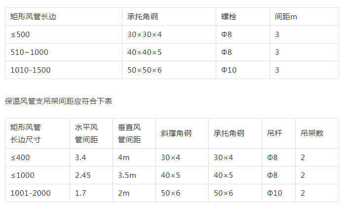 3、金屬矩形風管邊長>630mm,保溫風管邊長>800mm時,且管段長度大于1250mm或低壓風管單邊平面積大于1.2平方米、中、高壓風管大于1.0平方米,均應有加固措施。