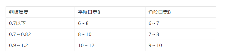 9、風管的咬口形式做如下選擇:矩形風管或配件的四角組合采用聯合角咬口。咬口寬度和留量根據板材厚度定,具體尺寸見下表: