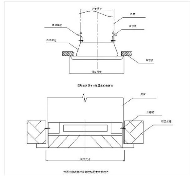 19、在安裝風口時,注意風口與所在房間內線條一致。尤其當風管暗裝時,風口要服從房間線條。吸頂安裝的散流器與吊頂平齊。風口安裝要確保牢固可靠。