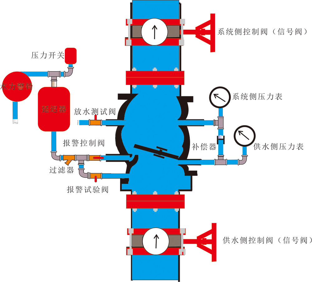 濕式報警閥體、系統(tǒng)側(cè)壓力表、供水側(cè)壓力表、補(bǔ)償器、放水測試閥(常閉)、報警控制閥(常開)、報警試驗閥(常閉)、過濾器、延遲器、壓力開關(guān)、水力警鈴