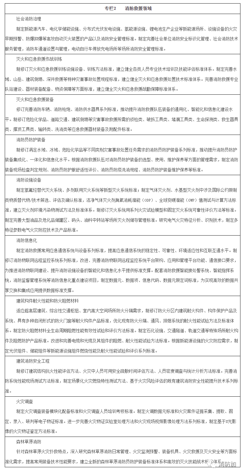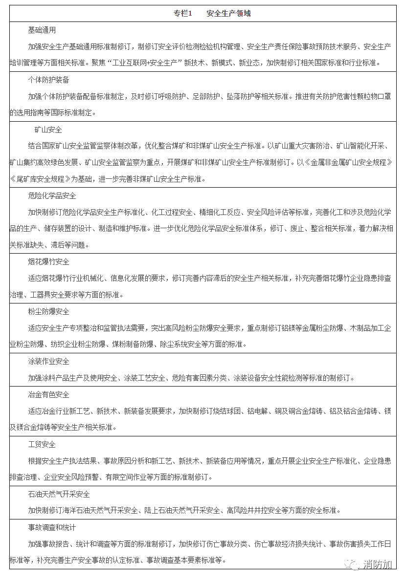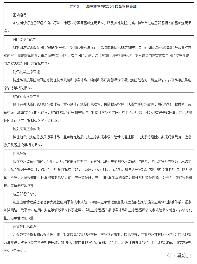 ?。ǘ┘涌焱七M(jìn)急需短缺和重要標(biāo)準(zhǔn)制修訂。循序漸進(jìn)務(wù)求實(shí)效,按照“先急后緩”原則加強(qiáng)統(tǒng)籌,集中力量加快修訂與人民生命安全關(guān)系最直接的標(biāo)準(zhǔn),爭(zhēng)取早日出臺(tái)、確保有效管用。密切跟蹤研究事故災(zāi)害暴露的標(biāo)準(zhǔn)化短板問(wèn)題,對(duì)標(biāo)落實(shí)法律法規(guī)和應(yīng)急管理標(biāo)準(zhǔn)體系建設(shè)要求,加快重點(diǎn)行業(yè)和關(guān)鍵領(lǐng)域標(biāo)準(zhǔn)立改廢。在安全生產(chǎn)方面,加強(qiáng)基礎(chǔ)通用標(biāo)準(zhǔn),個(gè)體防護(hù)裝備標(biāo)準(zhǔn),事故調(diào)查統(tǒng)計(jì)相關(guān)標(biāo)準(zhǔn),礦山安全、危險(xiǎn)化學(xué)品安全、煙花爆竹安全生產(chǎn)、石油天然氣開(kāi)采安全標(biāo)準(zhǔn),以及粉塵防爆、涂裝作業(yè)、冶金有色、工貿(mào)安全等領(lǐng)域重要標(biāo)準(zhǔn)制修訂;在消防救援方面,加快制修訂消防救援隊(duì)伍隊(duì)站建設(shè)、裝備建設(shè)、作戰(zhàn)訓(xùn)練,消防通信指揮信息化、消防物聯(lián)網(wǎng)建設(shè)、消防監(jiān)督檢查、消防產(chǎn)品監(jiān)督管理、社會(huì)消防治理、社會(huì)消防技術(shù)服務(wù)管理、火災(zāi)調(diào)查等相關(guān)標(biāo)準(zhǔn);在減災(zāi)救災(zāi)與綜合性應(yīng)急管理方面,加快制修訂應(yīng)急管理術(shù)語(yǔ)、符號(hào)、標(biāo)記和分類等基礎(chǔ)通用標(biāo)準(zhǔn),風(fēng)險(xiǎn)監(jiān)測(cè)和管控標(biāo)準(zhǔn),水旱災(zāi)害應(yīng)急管理標(biāo)準(zhǔn),地震災(zāi)害應(yīng)急救援相關(guān)標(biāo)準(zhǔn),地質(zhì)災(zāi)害應(yīng)急救援相關(guān)標(biāo)準(zhǔn),應(yīng)急裝備標(biāo)準(zhǔn),應(yīng)急管理信息化標(biāo)準(zhǔn),救災(zāi)和物資保障標(biāo)準(zhǔn),應(yīng)急預(yù)案制定和演練、救援現(xiàn)場(chǎng)指揮、專業(yè)應(yīng)急救援力量建設(shè)標(biāo)準(zhǔn),應(yīng)急救援事故災(zāi)害調(diào)查和綜合性應(yīng)急管理評(píng)估統(tǒng)計(jì)規(guī)范標(biāo)準(zhǔn),應(yīng)急救援教育培訓(xùn)標(biāo)準(zhǔn),以及其他防災(zāi)減災(zāi)救災(zāi)和綜合性應(yīng)急管理有關(guān)標(biāo)準(zhǔn)。