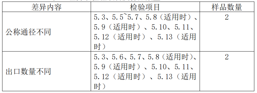 認證委托人在單元內選取公稱通徑最大的型號作為典型產品型號進行 5.2.3、5.3、5.5~5.7、5.8(適用時)、5.9(適用時)、5.10、5.11、5.12 (適用時)、5.13(適用時)、5.14 項目的檢驗,其他型號按照表 1 規定 進行差異項檢驗。