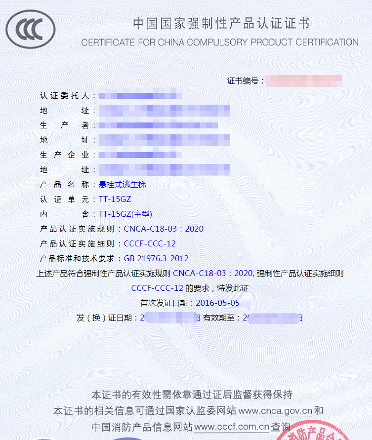 GB 21976.3-2012《建筑火災逃生避難器材 第 3 部分:逃生梯》 《強制性產品認證實施規則 避難逃生產品》 《強制性產品認證實施細則 避難逃生產品逃生類產品》